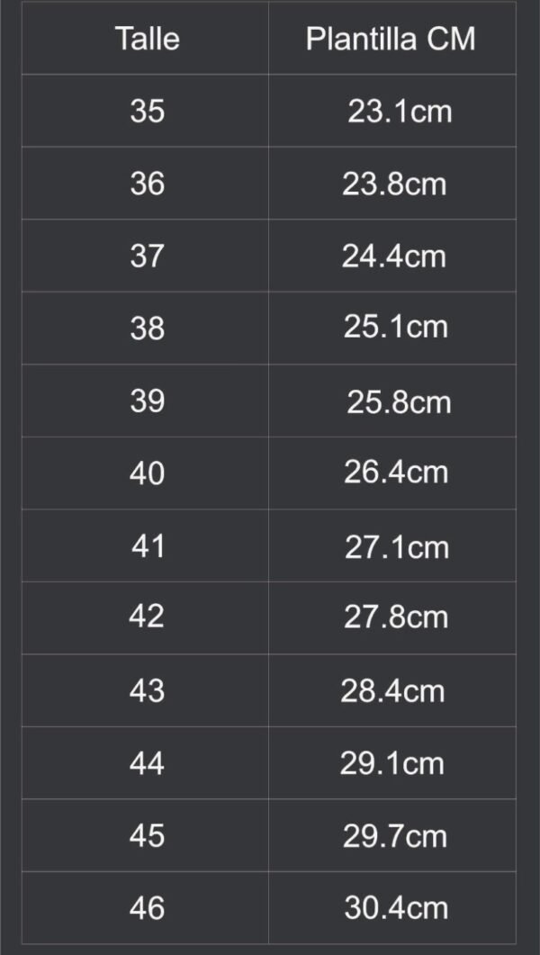 | Número | 35, 36, 37, 38, 39, 40, 41, 42, 43, 44, 45, 46 |